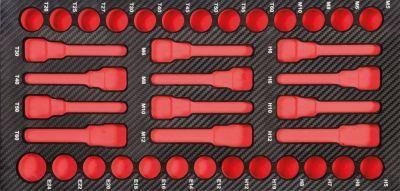 ProForm Einlage leer 1/2" 'KFZ' spezial 38-tlg. Werkstattwagen-Einlage mit Steckschlüsselwerkzeugen 12,5 [1/2"] nach DIN 3120 / ISO 1174 Ideale Werkzeugergänzung für das KFZ-Gewerbe Aus widerstandsfähigem EVA Polymerschaum mit stabiler Kunststoffoberfläche in hochwertigem Carbonfinish Langlebige und gut lesbare Werkzeugbeschriftung für mehr Übersichtlichkeit Hochwertige Optik, höhere Stabilität und geringere Schmutzanfälligkeit durch Carbonfinish Werkzeuge sauber, übersichtlich und sicher angeordnet 1/3 Einlagenmodul passend für alle PROJAHN-WerkstattwagenInhalt:7 Steckschlüssel-Einsätze für E-TX 12,5 [1/2"] E12 14 16 18 20 22 249 Bit-Steckschlüssel-Einsätze für Innen-TX-Schrauben 60 mm 12,5 [1/2"] T20 25 27 30 40 45 50 55 604 Bit-Steckschlüssel-Einsätze für Innen-TX-Schrauben 100 mm 12,5 [1/2"] T30 40 50 606 Bit-Steckschlüssel-Einsätze 60 mm für Innen-6-kant-Schrauben 12,5 [1/2"] 5 9 7 8 10 12 mm4 Bit-Steckschlüssel-Einsätze 100 mm für Innen-6-kant-Schrauben 12,5 [1/2"] 6 8 10 12 mm4 Bit-Steckschlüssel-Einsätze für Vielzahn-Schrauben 60 mm 12,5 [1/2"] M5 6 8 104 Bit-Steckschlüssel-Einsätze für Vielzahn-Schrauben 100 mm 12,5 [1/2"] M6 8 10 12