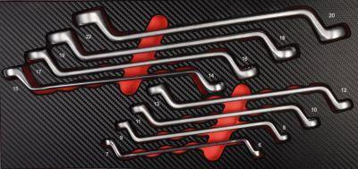 Doppelringschluessel Einlage 8tlg 8-tlg. Werkstattwagen-Einlage mit metrischen Doppelringschlüsseln nach DIN 838 Aus widerstandsfähigem EVA Polymerschaum mit stabiler Kunststoffoberfläche in hochwertigem Carbonfinish Langlebige und gut lesbare Werkzeugbeschriftung für mehr Übersichtlichkeit Hochwertige Optik, höhere Stabilität und geringere Schmutzanfälligkeit durch Carbonfinish Werkzeuge sauber, übersichtlich und sicher angeordnet 1/3 Einlagenmodul passend für alle PROJAHN-WerkstattwagenInhalt:8 Doppelringschlüssel DIN 838 6 x 7 8 x 9 10 x 11 12 x 13 14 x 15 16 x 17 18 x 19 20 x 22 mm
