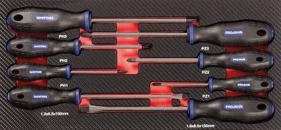 Schraubendreher Einlage "gemischt" 8tlg PH + PZ + Schlitz 8-tlg. Werkstattwagen-Einlage mit den wichtigsten PH-, PZ und Schlitz-Schraubendrehern Aus widerstandsfähigem EVA Polymerschaum mit stabiler Kunststoffoberfläche in hochwertigem Carbonfinish Langlebige und gut lesbare Werkzeugbeschriftung für mehr Übersichtlichkeit Hochwertige Optik, höhere Stabilität und geringere Schmutzanfälligkeit durch Carbonfinish Werkzeuge sauber, übersichtlich und sicher angeordnet 1/3 Einlagenmodul passend für alle PROJAHN-WerkstattwagenInhalt:3 Schraubendreher für Kreuzschlitz-Schrauben PH 1 2 33 Schraubendreher für Kreuzschlitz-Schrauben PZ 1 2 32 Schraubendreher für Schlitz-Schrauben 1,2 x 6,5 1,6 x 8,0 mm