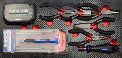 Elektronik Einlage 45tlg 45-tlg. Werkstattwagen-Einlage mit Elektronikzangen, Präszisions-Schraubendrehern und Bit-Box Aus widerstandsfähigem EVA Polymerschaum mit stabiler Kunststoffoberfläche in hochwertigem Carbonfinish Langlebige und gut lesbare Werkzeugbeschriftung für mehr Übersichtlichkeit Hochwertige Optik, höhere Stabilität und geringere Schmutzanfälligkeit durch Carbonfinish Werkzeuge sauber, übersichtlich und sicher angeordnet 1/3 Einlagenmodul passend für alle PROJAHN-WerkstattwagenInhalt:1 Bit-Box 31-tlg. (394075)1 Bit-Schraubendreher mit Schnellspannfutter kurz magnetisch 6,3 [1/4"] (4190-03)1 Elektronik-Flachzange (4330-130)1 Elektronik-Rundzange (4331-120)1 Elektronik-Kettenzange (4332-130)1 Elektronik-Kettenzange 45° (4333-120)1 Elektronik-Seitenschneider (4334-110)1 Präzisionsschraubendrehersatz mit 14 Schrauberklingen 8-tlg. (4711)