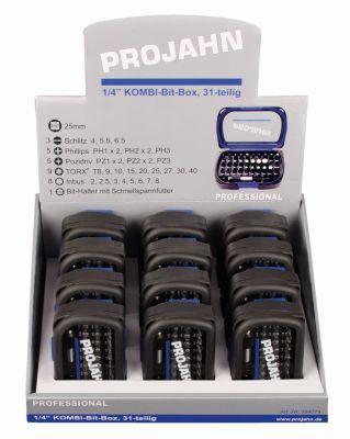 Verkaufsdisplay 12 x Bit Box 31tlg 394075 Bits aus hochwertigem S2-Spezialstahl gefertigt, ideal für den professionellen Anwender geeignet Hervorragender Rundlauf für ermüdungsfreies und schnelles Arbeiten 2-Komponentenmaterial – bruchsicherer, stabiler Kern und griffige Ummantelung mit hoher Rutschhemmung Hohe Stoß und Bruchfestigkeit durch zusätzlich stoßgedämpfte Ecken Kompaktes und ergonomisches Design Kontrastreiche Bedruckung: Bitabmessungen optimal und lange lesbar Hochwertiger und moderner Gesamteindruck Drehbarer Gürtelclip mit 45° Einrastfunktion Transparente Sichtscheibe im DeckelInhalt:3 Schraubendreher-Einsätze / Bits für Schlitz-Schrauben 6,3 [1/4"] 4 5,5 6,55 Schraubendreher-Einsätze / Bits für Kreuzschlitz-Schrauben PH 6,3 [1/4"] PH 1 1 2 2 35 Schraubendreher-Einsätze / Bits für Kreuzschlitz-Schrauben PZ 6,3 [1/4"] PZ 1 1 2 2 39 Schraubendreher-Einsätze / Bits für TX-Schrauben 6,3 [1/4"] TX mit Bohrung 8 9 10 15 20 25 27 30 408 Schraubendreher-Einsätze / Bits für Innen-6-kant-Schrauben 6,3 [1/4"] 2 2,5 3 4 5 6 7 8 mm1 Bit-Magnethalter mit Schnellspannfutter 6,3 [1/4"] 60 mm
